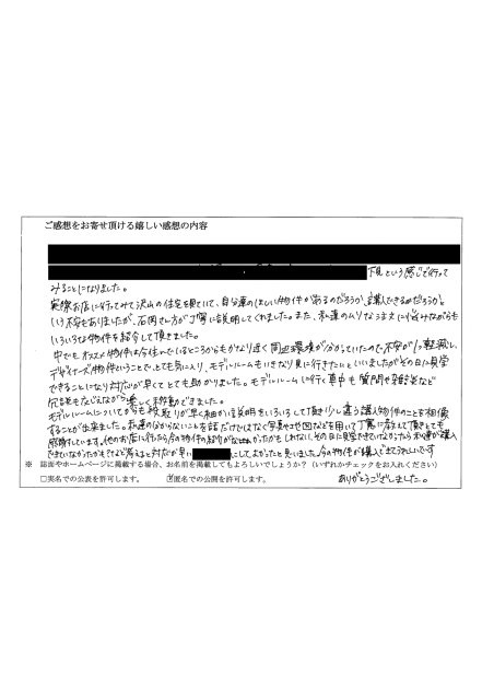 他のお店に行ったら今の物件の紹介がなかったかもしれない、その日に見学できていなかったら私達が購入できていなかったかも?など考えると対応が早い〇〇〇〇にしてよかったと思いました。